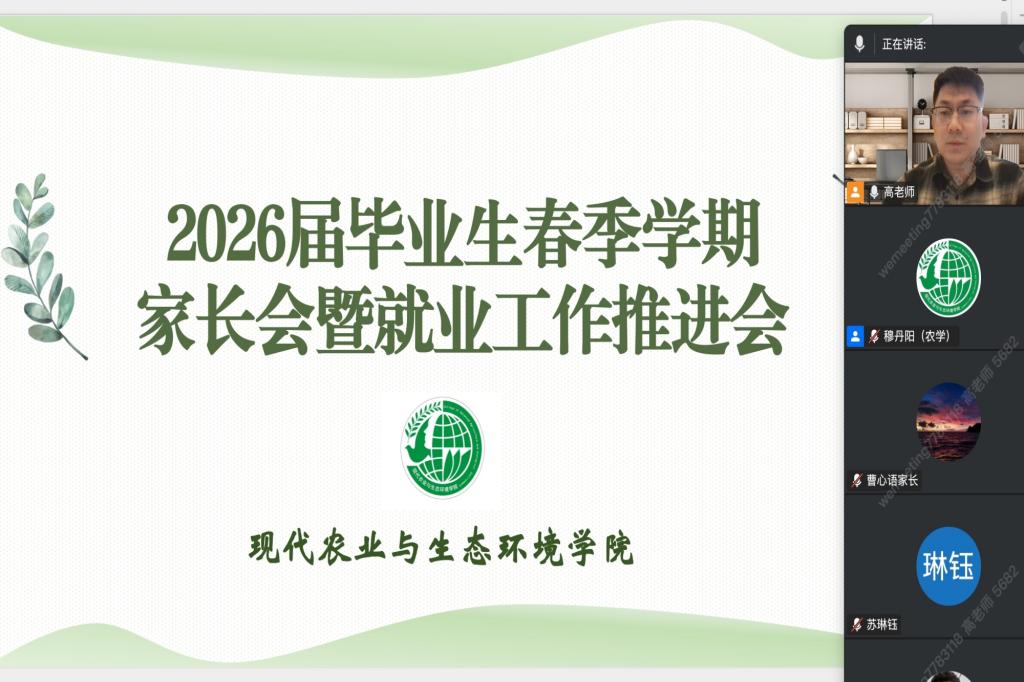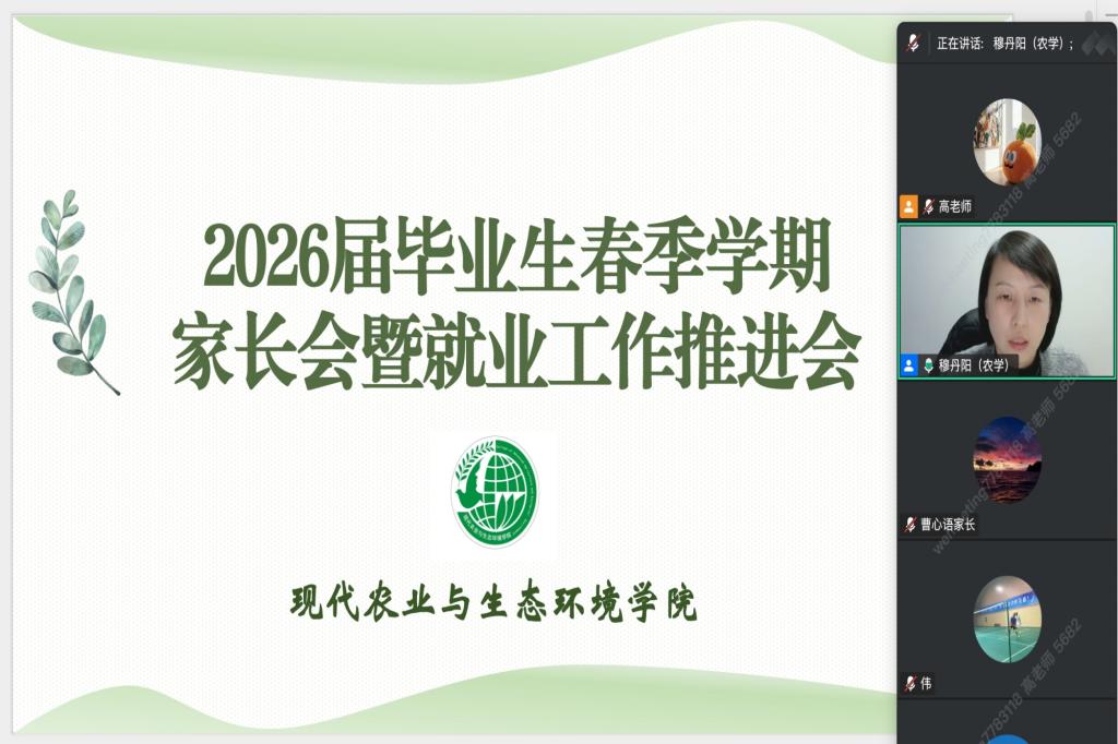 为深入贯彻落实党中央、国务院关于高校毕业生就业工作的决策部署,进一步凝聚家校合力,精准推进2026届毕业生就业工作。3月19日,现代农业与生态环境学院通过腾讯会议召开2026届本科毕业生家长会暨就业工作推进会。学院党委副书记穆丹阳、2026届本科毕业生辅导员高健以及2026届本科毕业生家长参加了此次会议。