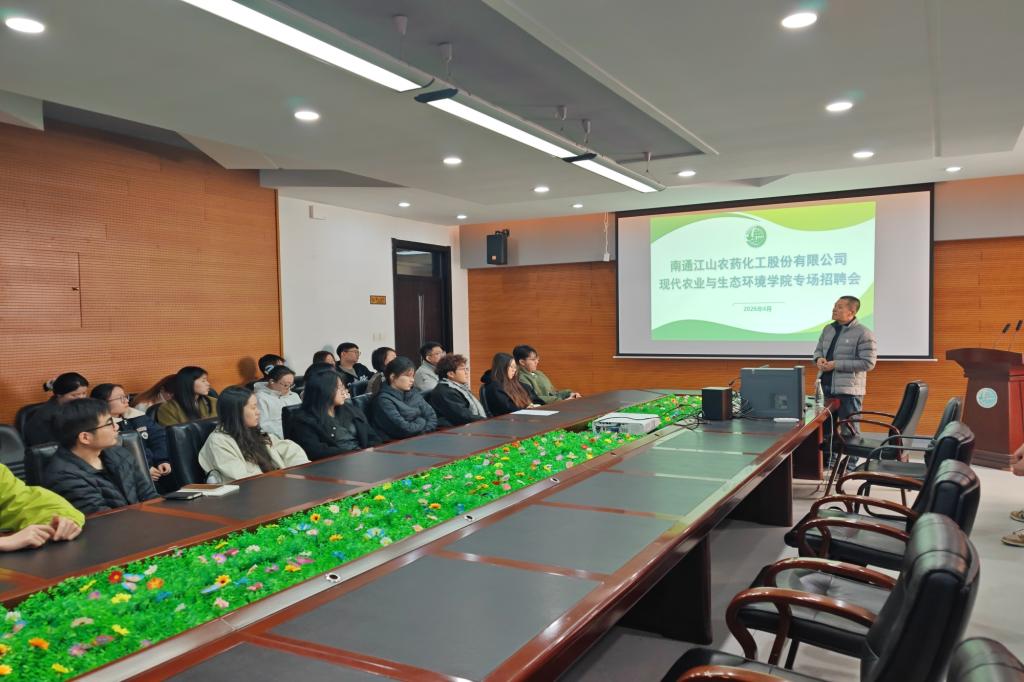 2026年4月1日,现代农业与生态环境学院在农学楼215会议室举办南通江山农药化工股份有限公司专场招聘会。本次专场招聘会立足农科专业特色,深化校企协同育人机制,持续拓宽毕业生就业渠道,为学院2026届毕业生搭建精准、高效的就业对接平台。出席本次招聘会的有南通江山农药化工股份有限公司招聘负责人姚树申、官义皓、王焕然,学院党委副书记穆丹阳、毕业年级辅导员高健和汤博宇,以及本硕求职毕业生。