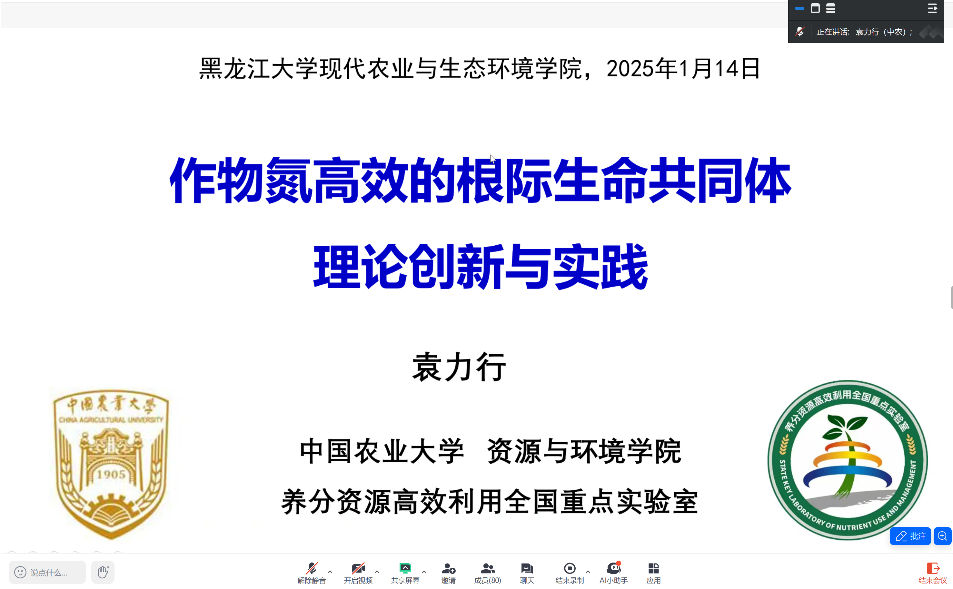 为进一步提升学生的学术素养,增强对学科前沿动态的了解,提高其对学术前沿的关注,黑龙江大学现代农业与生态环境学院积极响应教务处号召,组织开展学生“国际学术周”活动。学院于1月14日19:30-20:30进行题为“作物氮高效的根际生命共同体理论创新与实践”的线上专家学术讲座,邀请嘉宾为中国农业大学资环学院院长,中国植物营养与肥料学会植物营养生物学专业委员会主任,中国土壤学会土壤-植物营养专业委员会委员袁力行教授。现代农业与生态环境学院副院长路运才教授主持本次讲座,现代农业与生态环境学院兴旺院长对本次讲座专家进行介绍。学院党委书记金鹏、副院长焦晓光、各专业教师以及本科生、研究生共同参加了本次讲座。